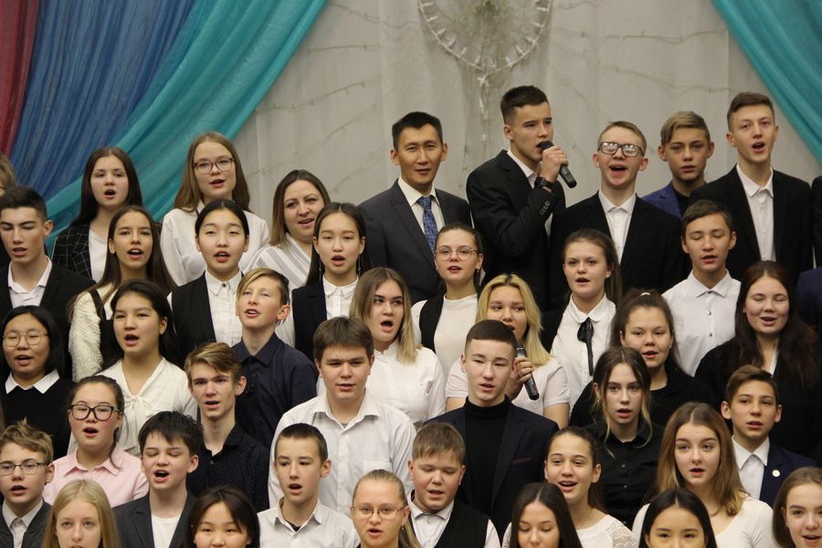 В актовом зале собрались учащиеся 8-11 классов, которым вкратце рассказали об указе главы Якутии. И затем они вместе с педагогами и гостями исполнили гимн, слова которого проецировались на стену. Было видно, что подавляющее большинство школьников знает слова гимна наизусть.