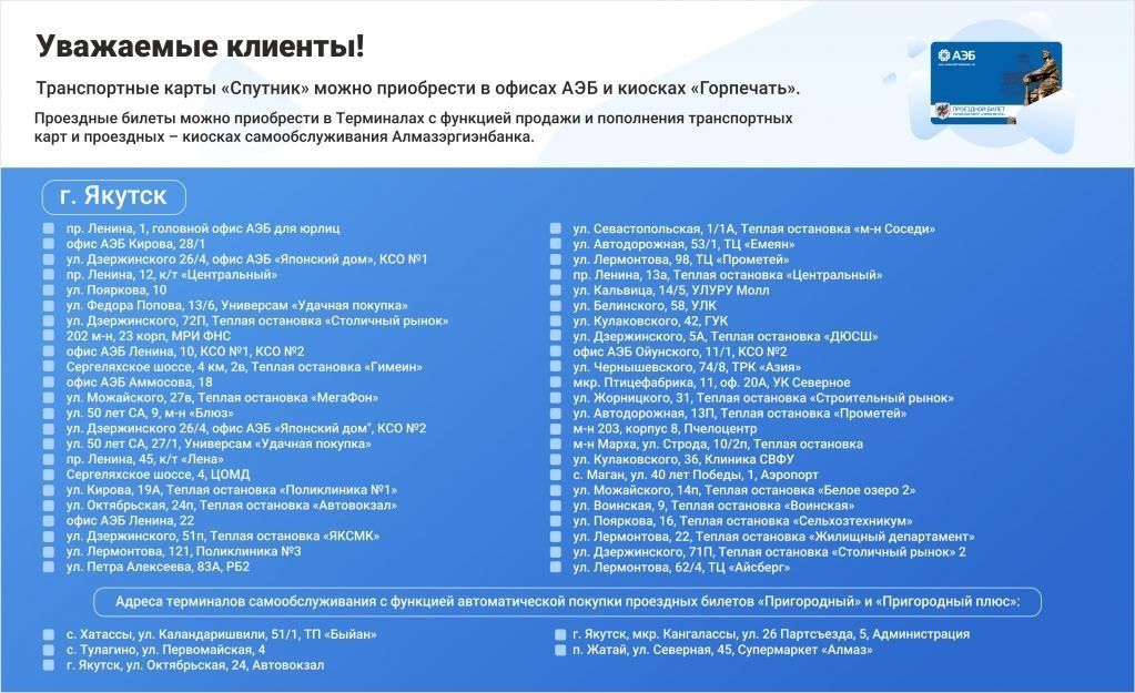 Проездные билеты можно приобрести в платежных терминалах с функцией продажи и пополнения транспортных карт и проездных – киосках самообслуживания Алмазэргиэнбанка. Адреса терминалов АЭБ Вы можете посмотреть на сайте банка и в приложении Карты «2ГИС».