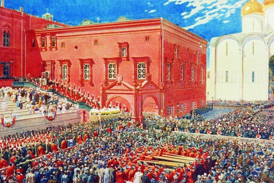 Рис. № 3. Возложение короны – 14 мая. Съ рисунка Е. Самокишъ-Судковской – 258 – 259 стр. Реконструкция цвета старинного рисунка осуществлена ФНД.