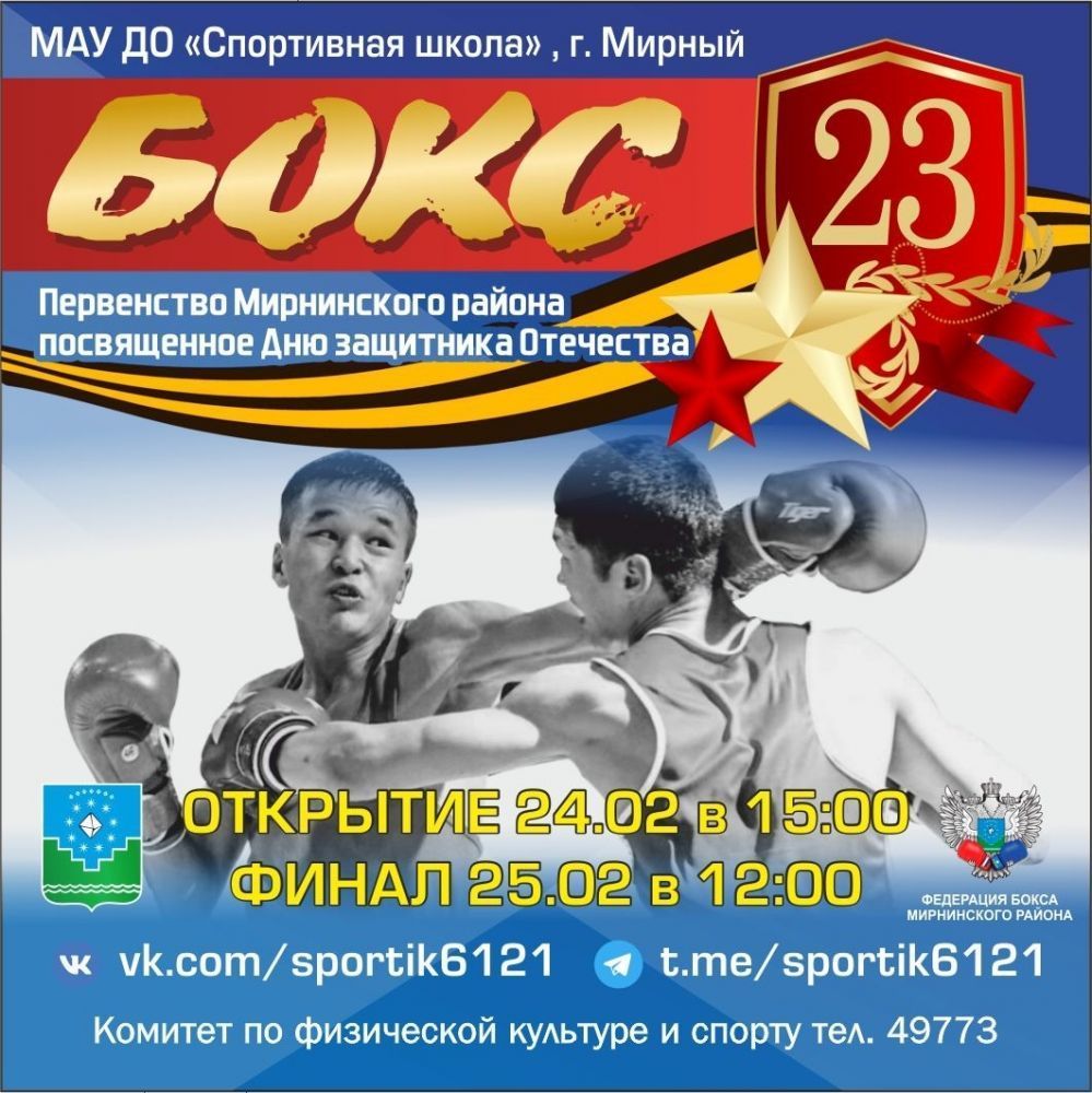 С 23 по 25 февраля в зале бокса МАУ ДО «Спортивная школа» по адресу г. Мирный ул. Индустриальная, 1 состоится первенство Мирнинского района по боксу, посвященное Дню защитника Отечества.