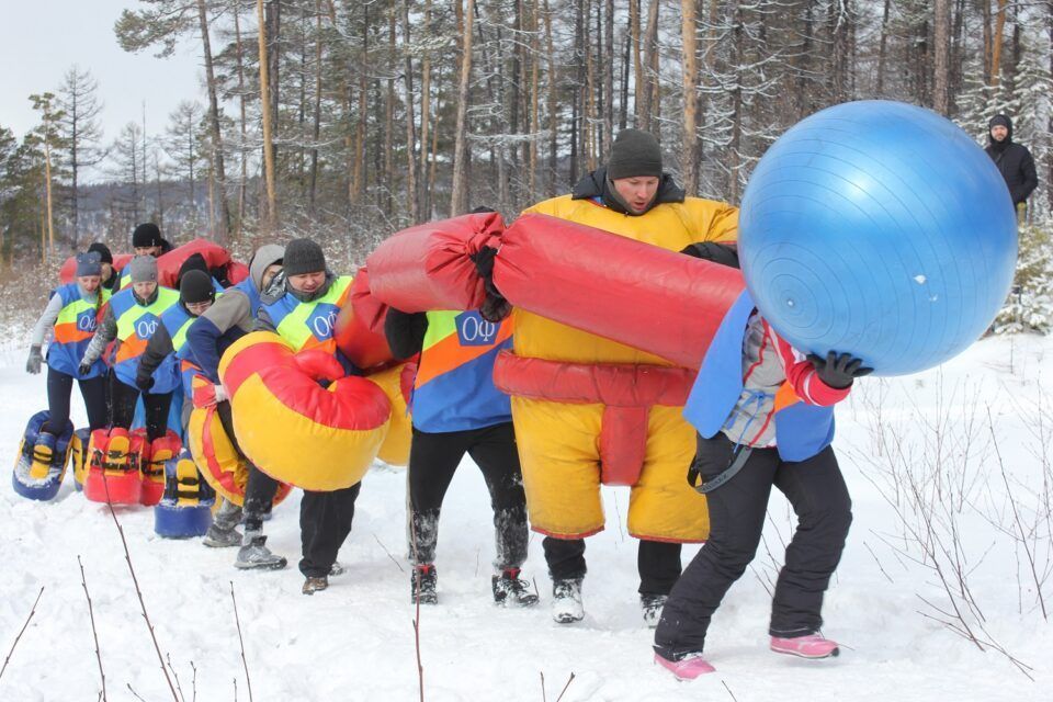 Участники играли в футбол на снегу в огромных ботинках, соревновались в метании надувного копья и перетягивании каната, боксировали в гигантских перчатках, принимали участие в командных эстафетах и – вне зачета – лепили креативных снеговиков.