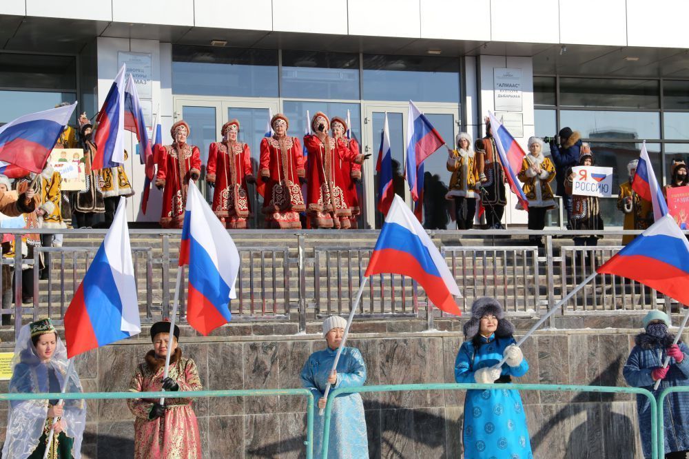 18 марта на площади Ленина в городе Мирный прошло мероприятие в честь Крымской весны. В мероприятии приняли участие студенты Мирнинского политехнического института, регионального технического колледжа, учащиеся школ, сотрудники районной и городской администраций, жители алмазной столицы.
