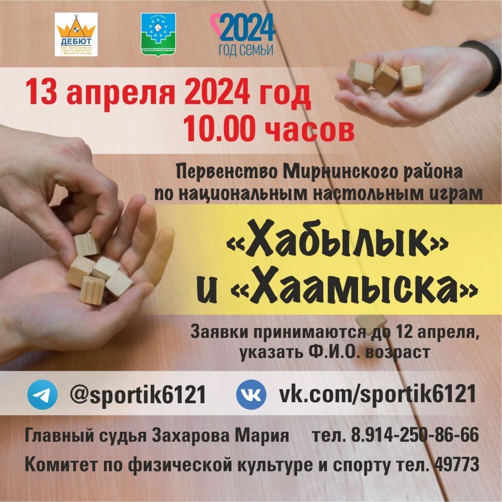 13 апреля в г. Мирный, в спортивном зале МПТИ (Ф) СВФУ состоится первенство Мирнинского района по национальным настольным играм «Хабылык» и «Хаамыска».