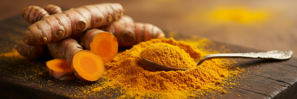 Куркума, а точнее ее биоактивный компонент куркумин, известна противовоспалительными свойствами. Однако куркумин имеет низкую биодоступность. Для ее повышения часто используют экстракты или биоусилители, например пиперин из черного перца, который, как доказано, может увеличивать усвоение куркумина на 154%.