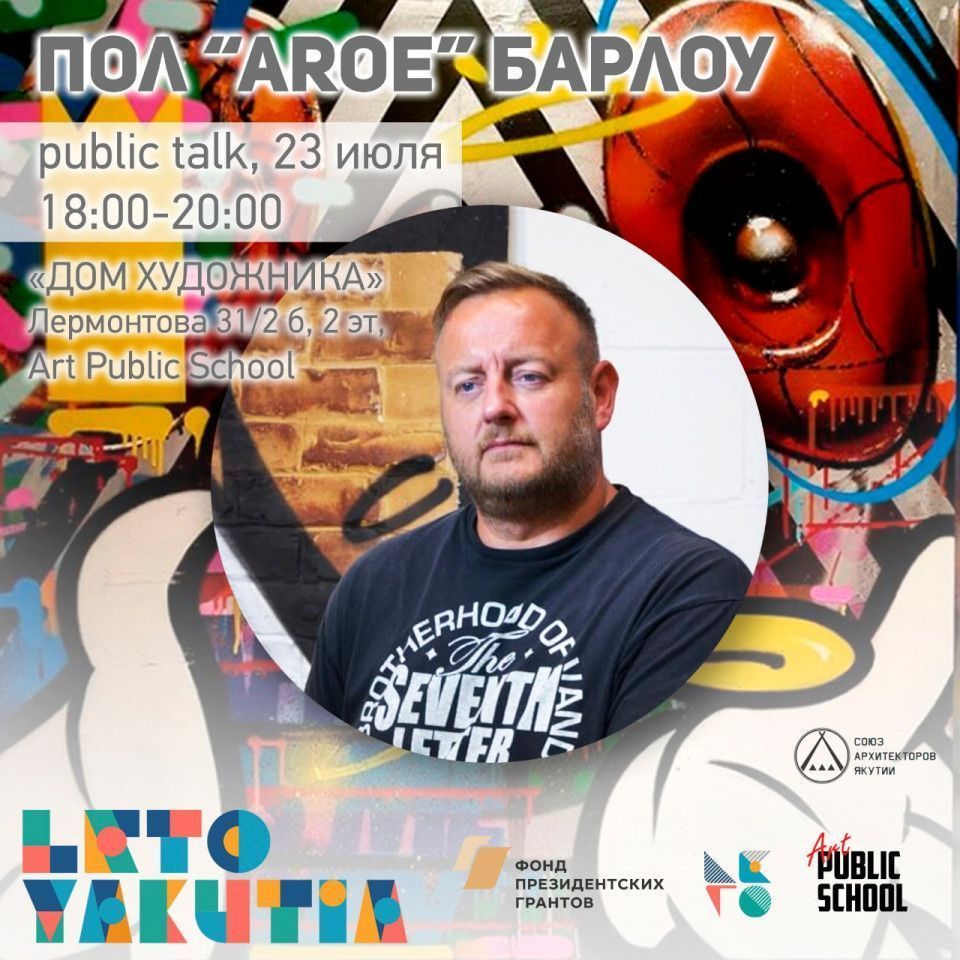 Сегодня, 23 июля в Якутске в Доме Художника Пол “AROE” Барлоу расскажет о своей творческой работе в разных стилях, поделится опытом создания арт-объектов в городах и ответит на все интересующие вопросы.