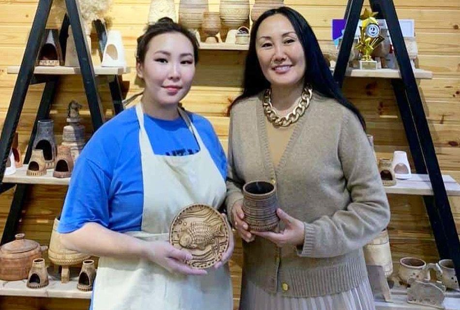 Руководитель мастерской, гончар Кристина Яковлева показала Людмиле Николаевой технологический процесс создания ручных керамических изделий из якутской глины: кытыйа, чоронов, камельков, сосудов для окуривания, чайной посуды.