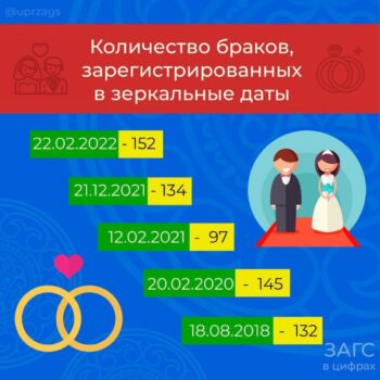 В последние два года из-за ограничениями, связанных с коронавирусом, заключивших браки в красивые и зеркальные даты было не так много. Например, 20.02.2020 свои отношения зарегистрировали 145 пар по республике, 12.02.2021 – 97, в разгар пандемии 21.12.2021 – 134, а вот до пандемии 18.08.2018 – 132.