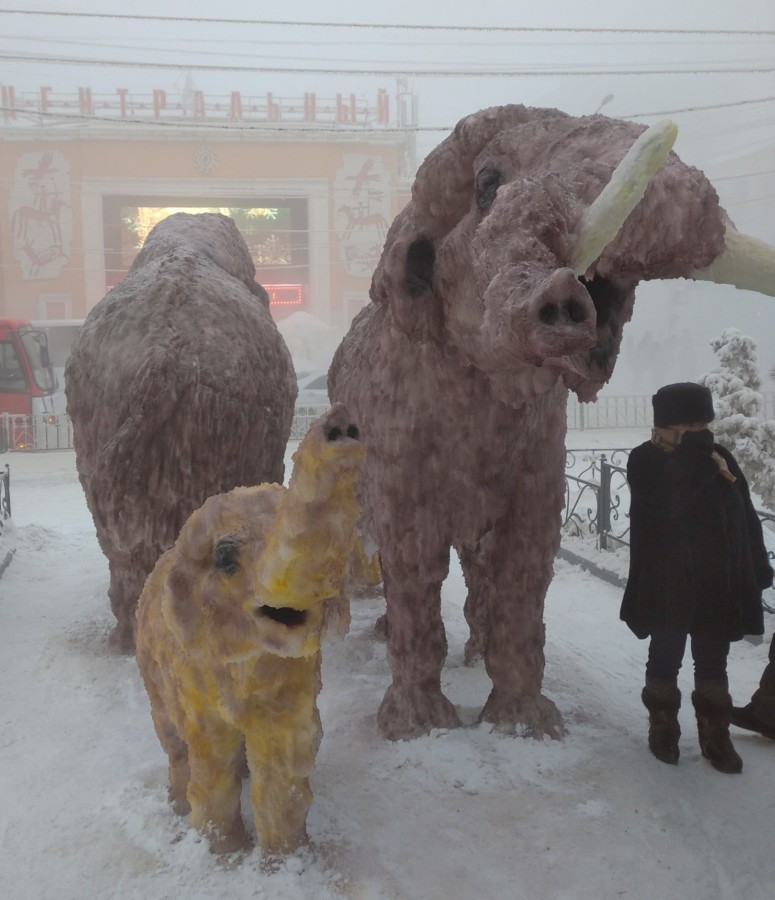 Саввиновы уже не в первый раз изготавливают грандиозные снежно-ледяные композиции: так, два года назад они изваяли мамонта и мамонтенка, а в прошлом – семейство белых медведей — Колыману, Ломоносова и Харчаану. Творение нынешнего — семейка мамонтов.