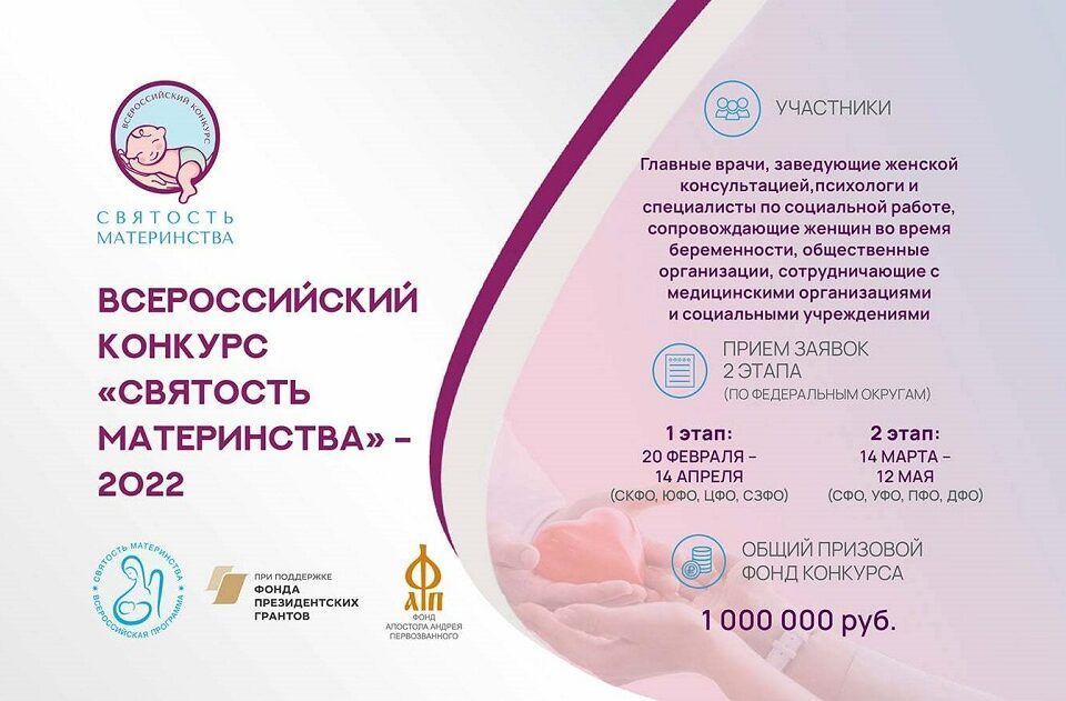 Фонд Андрея Первозванного приглашает к участию во Всероссийском конкурсе «Святость материнства — 2022» государственные и муниципальные медицинские организации, учреждения социального обслуживания, врачей акушеров-гинекологов, психологов и специалистов по социальной работе, сопровождающих женщин во время беременности и семьи в трудной жизненной ситуации, а также общественные организации, сотрудничающие с медицинскими организациями и социальными учреждениями на основе соглашения или договора, сообщает пресс-служба главы и правительства Якутии.