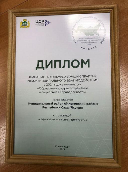 Мирнинский район получил диплом финалиста конкурса в номинации «Образование, здравоохранение и социальная справедливость» за реализацию муниципальной программы «Создание условий для оказания медицинской помощи населению и охраны здоровья граждан на 2019-2023 годы». Программу на конкурсе представляла координатор - начальник отдела медицинского обеспечения районной администрации Бобровская Т.А.