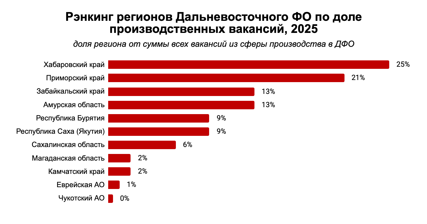 Эксперты Hh.ru проанализировали ситуацию в сфере производства в Дальневосточном федеральном округе, и выяснили, в каких регионах сложился наибольший спрос на кадры в 2025 году и где самые конкурентные зарплатные предложения.