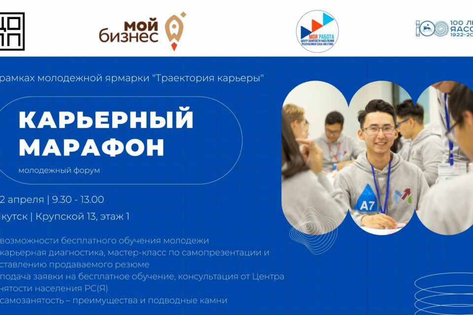 На площадке центра опережающей профессиональной подготовки Якутии 22 апреля в рамках реализации федерального проекта «Содействие занятости» нацпроекта «Демография» и республиканской онлайн-ярмарки «Траектория карьеры» состоится работа открытой площадки «Карьерный марафон».
