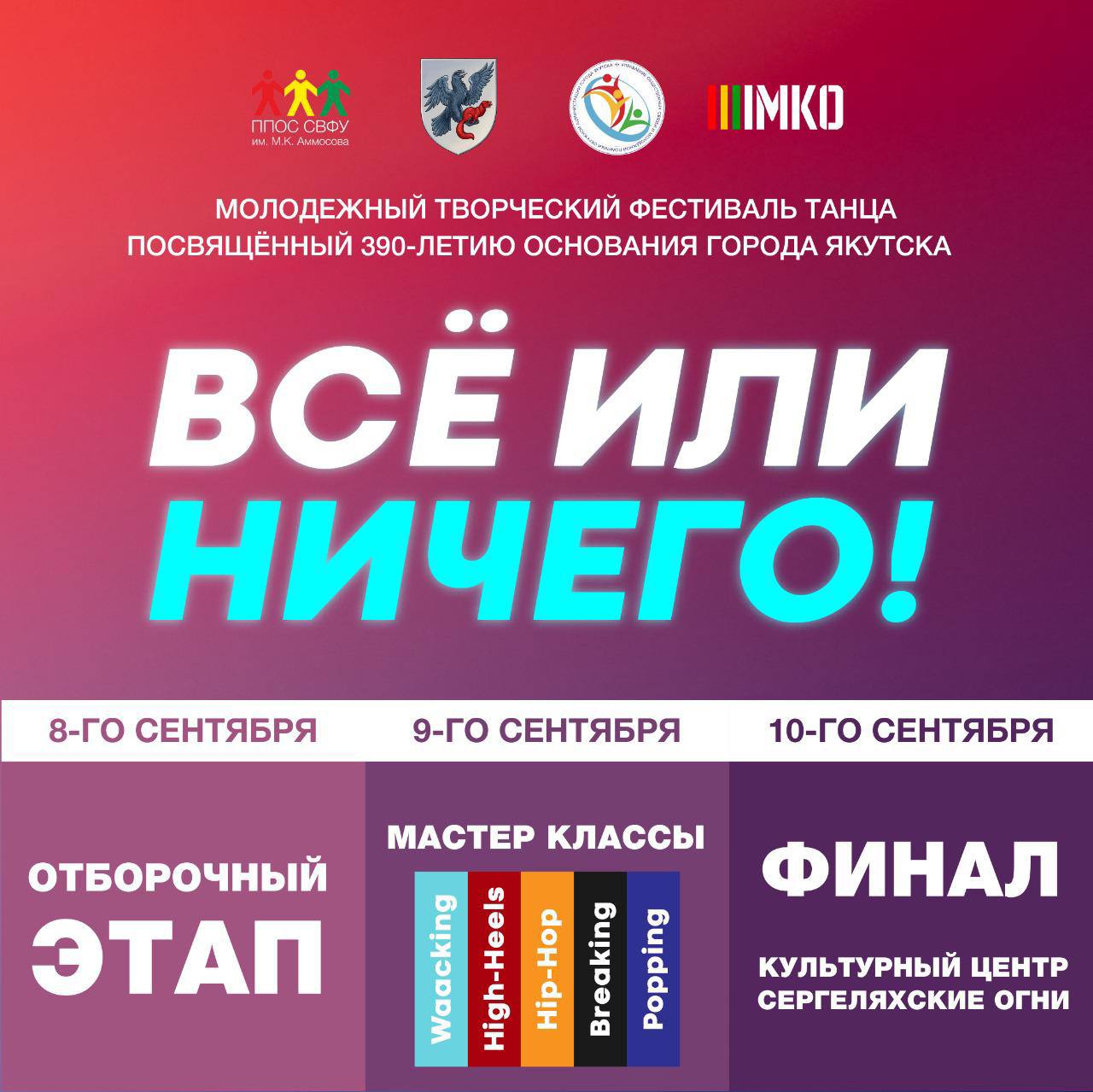 10 сентября в культурном центре «Сергеляхские огни» состоится финал молодёжного творческого фестиваля-конкурса танца «Всё или ничего». В конкурсе принимают участие школьники и молодёжь до 35 лет. Призовой фонд составляет 60 тысяч рублей, передаёт ЯСИА.