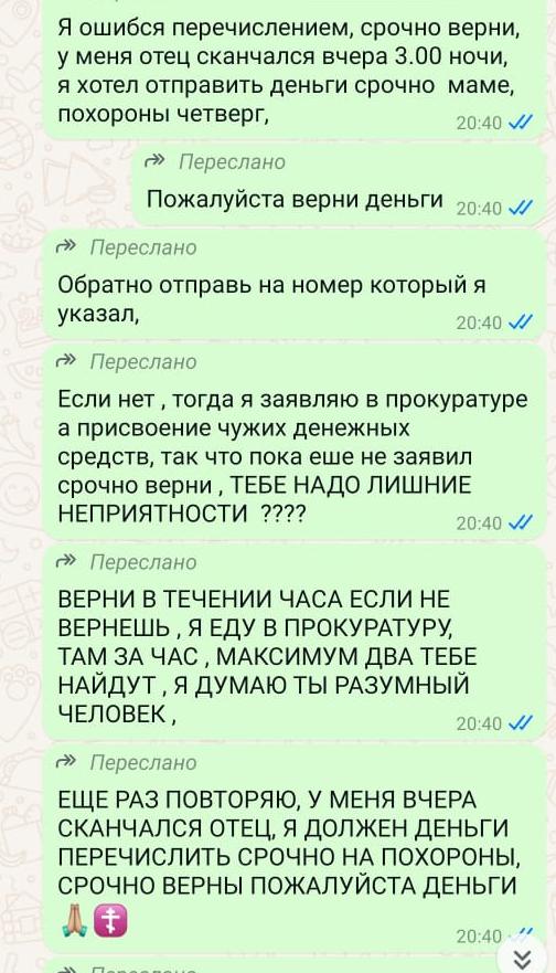 «*************, на имя ************ было перечислена ошибочно деньги в размере 12691 рубль , мы звонили ************, но она отключает телефон, там стоит автоответчик, на ней заведено уголовное дело за незаконное присвоение чужого финансового средство, Вы как директор, я Вас очень прошу, пока не испачкали имя Вашей коллеги , предупредите ей чтобы она в срочном порядке перечислила обратно эту сумму обратно через сбербанк онлайн на телефон ******** владелец карты Светлана Николаевна П. Я работаю в такси яндекс , сам я из Грузии, у меня 2 ого декабря скончался отец, хотел перечислить деньги, в спешке ошибся в одном цифре , и деньги перечислилось на номер Вашей сотрудницы, я сам из Казани, мы писали ей вацап, но она не отвечает, пожалуйста предупредите ее что за ней возбужденно уголовное дело, зачем ей лишние неприятности, скажите ей пусть срочно вернет деньги обратно , моего отца вчера похоронили, а впереди еще 9 дней, пожалуйста верните мне обратно деньги , так передайте ее , присылаю фото то что мы ей на вацап прислали, чтобы Вы не думали что это история придуманное».