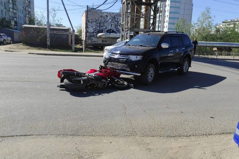 В субботу, 3 июня, на улице Кальвица в Якутске внедорожник Mitsubishi Pajero Sport столкнулся с мотоциклом Honda VTR 1000F. В аварии пострадал 42-летний водитель мотоцикла, его госпитализировали в больницу с различными переломами, сообщает столичная Госавтоинспекция.