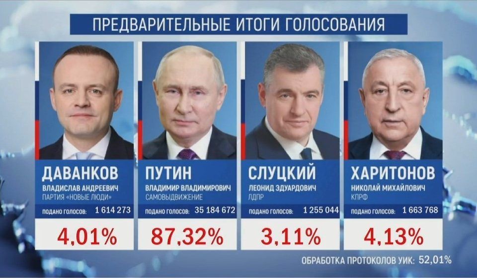 По данным информационного центра ЦИК РФ, после обработки 52,01% протоколов УИК первое место на выборах президента РФ занимает Владимир Путин, набрав 87,32% голосов. За действующего главу государства подано более 35 млн голосов. На втором месте идет Николай Харитонов (4,13%), на третьем — Владислав Даванков с 4,01%, четвертым идет Леонид Слуцкий (3,11%).