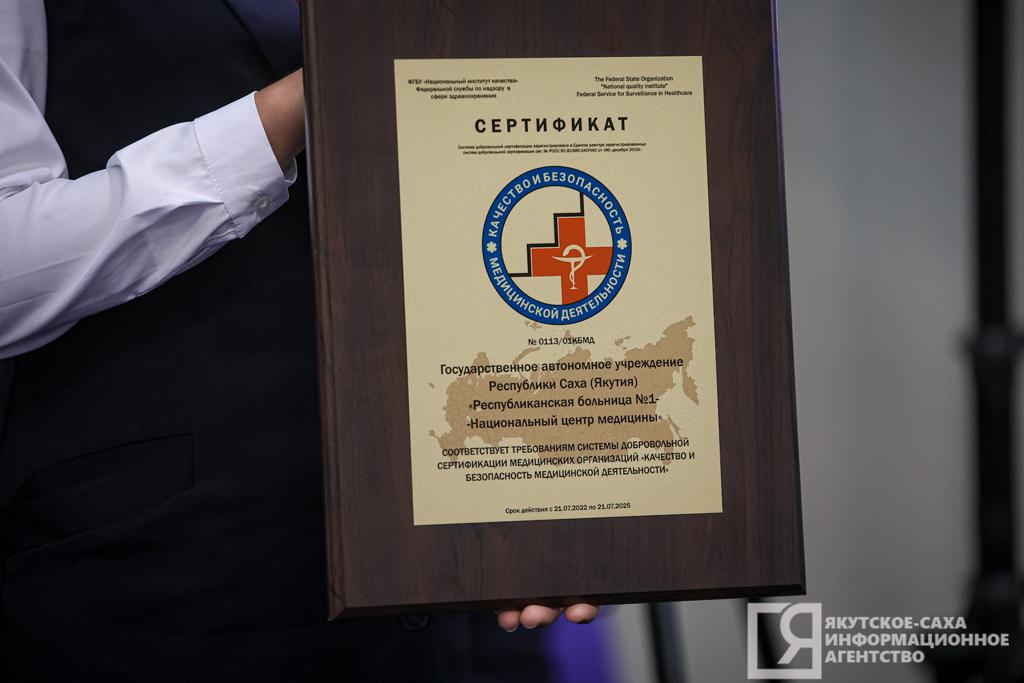 Республиканская больница № 1 — Национальный центр медицины — первая медицинская организация Якутии, которая получила сертификат качества и безопасности медицинской деятельности Росздравнадзора. Вручение подтверждающего документа прошло на ВЭФ-2022 с участием главы Якутии Айсена Николаева, сообщает ЯСИА.