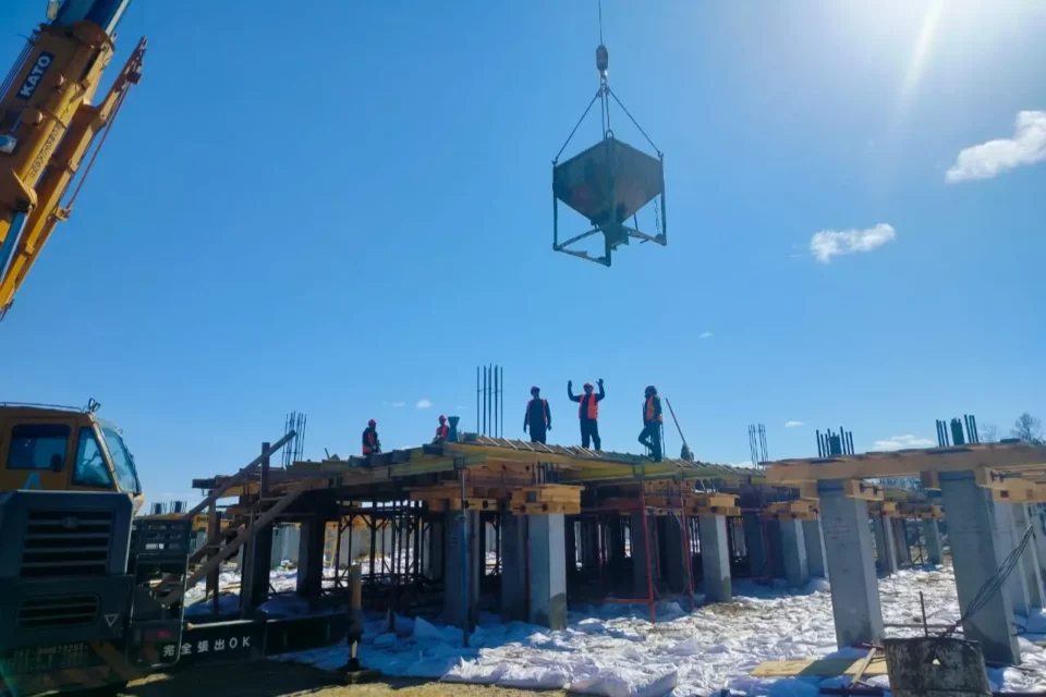 На сегодняшний день обустраивают цокольное перекрытие. Всего залито 112 куб. метров бетона. На объекте задействовано 28 работников.