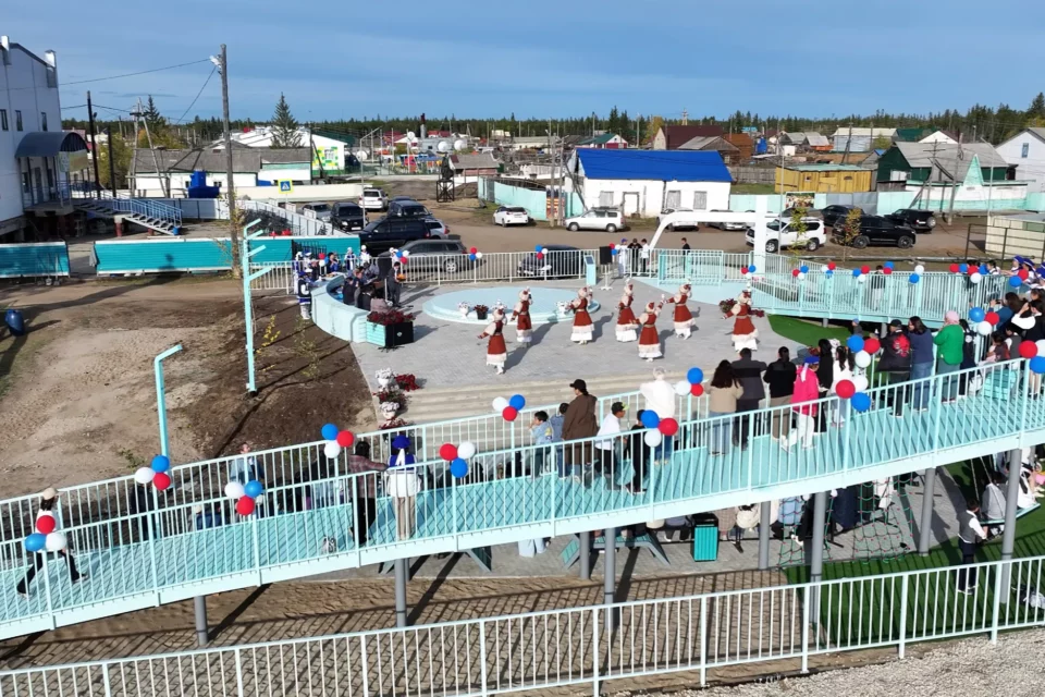Центральным элементом благоустройства стала событийная зона со сценой и амфитеатром. Для детей обустроена современная площадка с песочницей и канатным комплексом. Важной точкой притяжения стала многофункциональная смотровая площадка с качелями, выполненная в форме изгибов реки Вилюй.