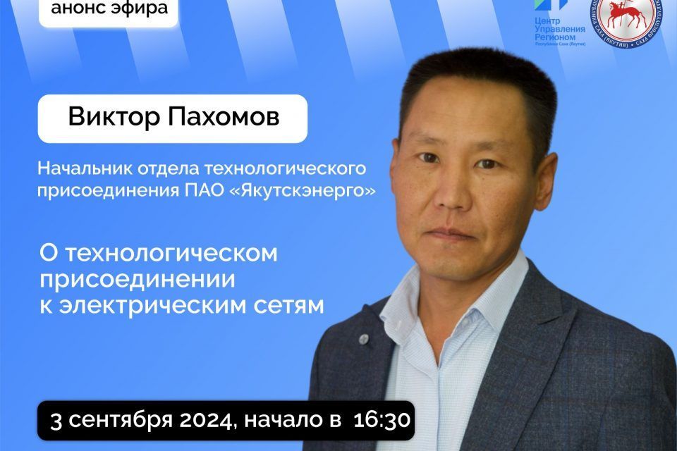 Во вторник, 3 сентября, в прямом эфире выступит начальник отдела технологического присоединения ПАО «Якутскэнерго» Виктор Пахомов. Об этом сообщает пресс-служба главы и правительства региона.