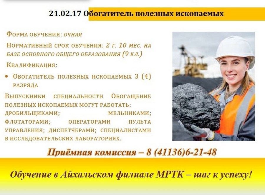 В 2022-2023 учебном году «Айхальский филиал алмазодобывающей промышленности» «ГАПОУ РС(Я) «МРТК» открывает набор студентов по профессии «Обогатитель полезных ископаемых».