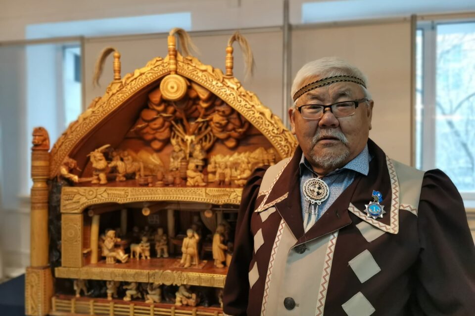 На выставке представлена цельная композиция «Сказание Олонхо у богатого Тойона», которую мастер вырезал в течение 2007 и 2008 годов.
