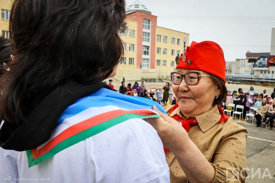Общественные деятели, ветераны пионерского и детского движения Дворца детского творчества, участники интенсива по подготовке вожатых «ИГРА», бойцы регионального отделения «Российских студенческих отрядов» торжественно повязали новобранцам галстуки с изображением якутского флага.