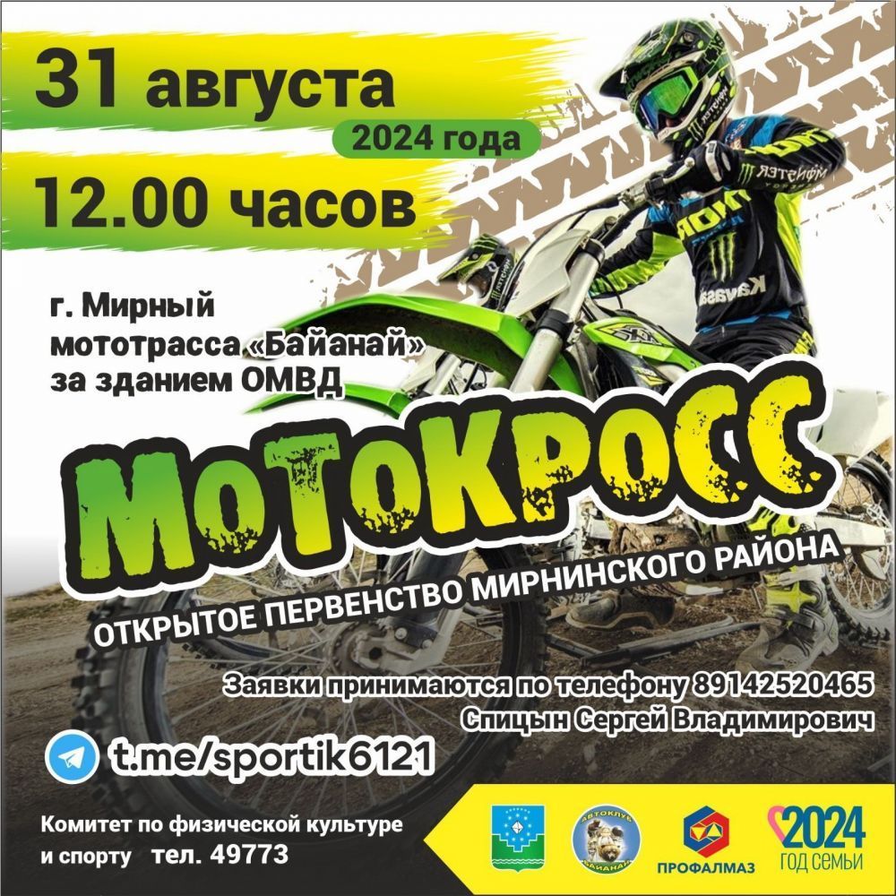 31 августа 2024 г. в 12-00 часов на мототрассе «Байанай» за ОМВД России по Мирнинскому району состоится открытое первенство Мирнинского района по мотокроссу.