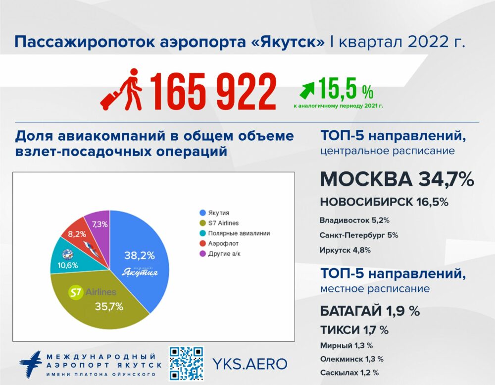 Самыми востребованными маршрутами аэропорта «Якутск» по объему пассажиропотока в I квартале были: по направлениям центрального расписания – Москва (33,7 % от общего пассажиропотока), Новосибирск (16,5 %), Владивосток (5,2 %), Санкт-Петербург (5 %), Иркутск (4,8 %); по региональным перевозкам – Батагай (1,9 %), Тикси (1,7 %), Мирный (1,3 %), Олекминск (1,3 %), Саскылах (1,2 %).