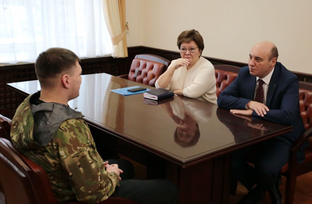 Глава района Александр Басыров вручает Евгению традиционный клинок с памятной надписью. А чуть позже дроновод получит новый индивидуальный детектор «Булат», которые в алмазном крае закупаются для всех бойцов ушедших на фронт из Мирнинского района. Парень – эксперт в этой теме и высоко оценивает полезность прибора, который мы покупаем на собранные людьми средства.