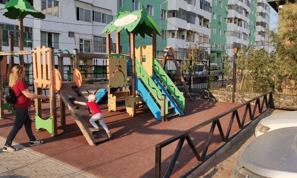 На территории 202 микрорайона в Якутске полностью восстановлена старая детская площадка: поднята и забетонирована её территория, а поверх бетона уложено мягкое покрытие, чтобы дети не травмировались.