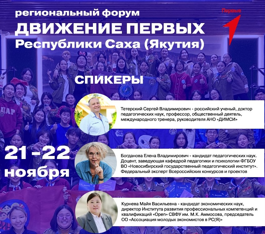 21 и 22 ноября в Якутске состоится первый региональный форум «Движение первых» республиканского отделения российского движения детей и молодежи «Движение первых». Форум соберет представителей местных отделений, участников движения из разных районов и председателей координационных советов всех уровней.