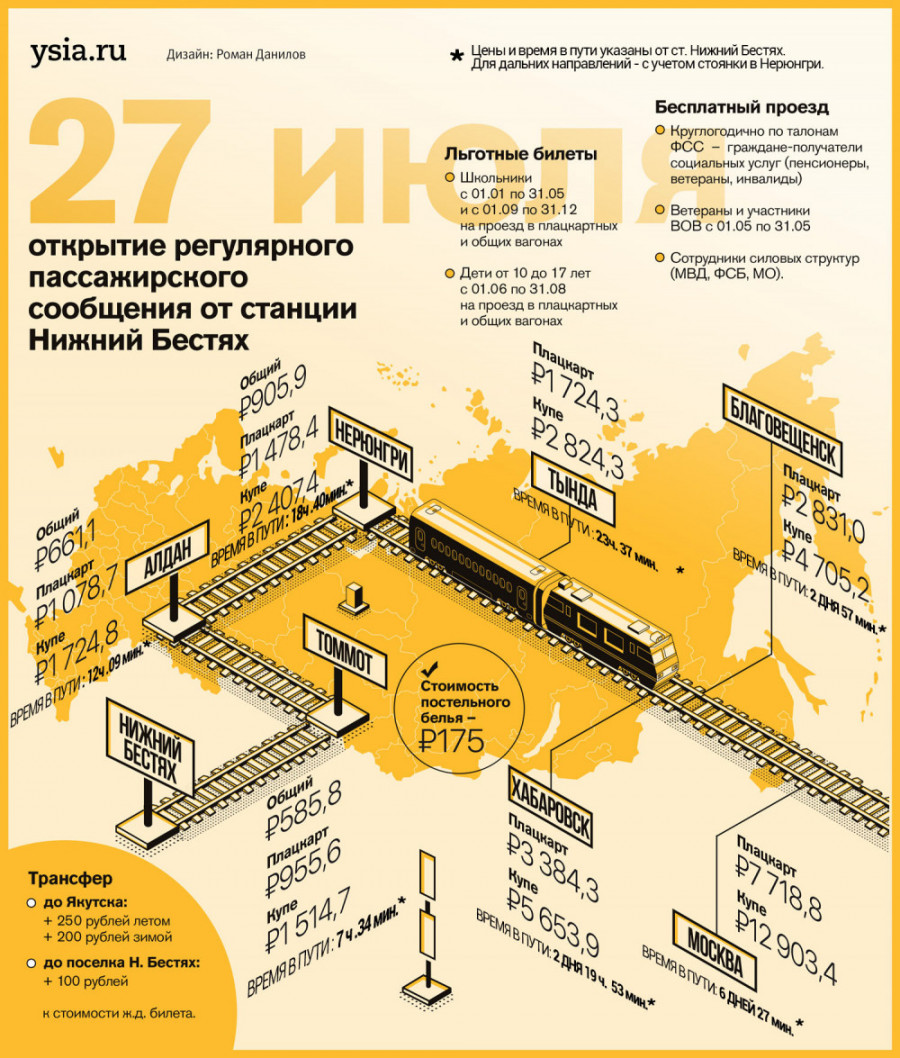 27 июля официально открывается пассажирское сообщение от станции Нижний Бестях. Как сообщили ЯСИА в АО «Железные дороги Якутии», добраться поездом можно будет до Нерюнгри, Тынды, Благовещенска, Хабаровска и Москвы.