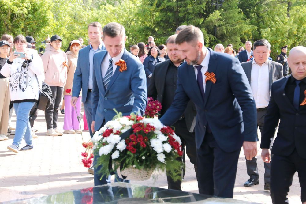Мирнинцы возложили цветы к парапету Вечного огня, в который замурованы капсулы с землей городов-Героев, привезенной с полей сражений.