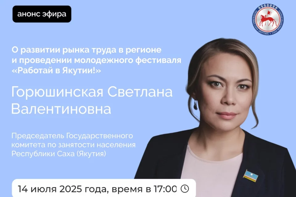 Председатель Государственного комитета по занятости населения Якутии Светлана Горюшинская в понедельник, 14 июля, проведет прямой эфир на официальных страницах администрации главы и правительства республики в социальных сетях «ВКонтакте» и «Одноклассники».