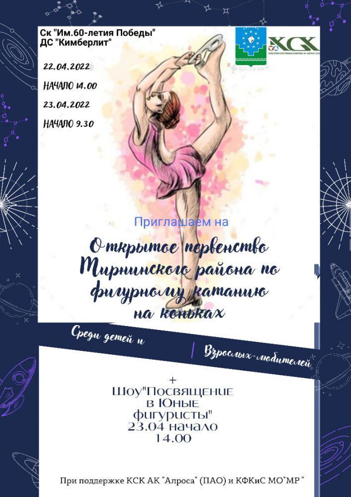 22-23 апреля на ледовой арене спортивного комплекса «Кимберлит» состоится открытое первенство Мирнинского района по фигурному катанию на коньках среди детей и взрослых – любителей.