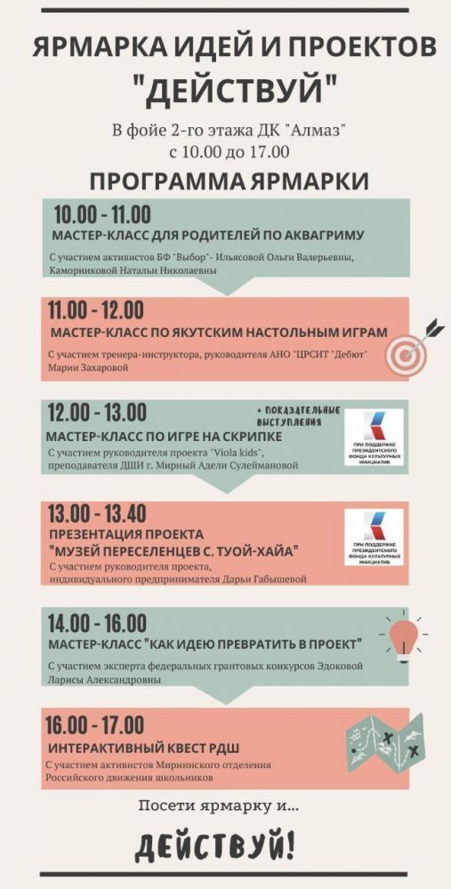 Администрация Мирнинского района и Мирнинское отделение Ассамблеи народов Республики Саха Якутия приглашают жителей города Мирный на ярмарку идей и проектов "Действуй".