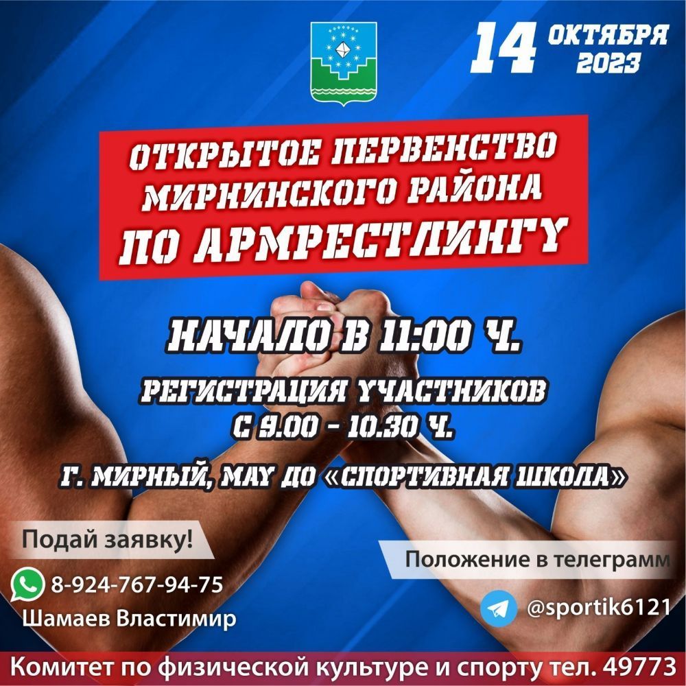14 октября в 11.00 в «Спортивной школе» (ул. Индустриальная д.1) состоится открытое первенство Мирнинского района по армрестлингу. Регистрация и взвешивание участников с 09.00 до 10.30 Это очень зрелищный вид спорта...