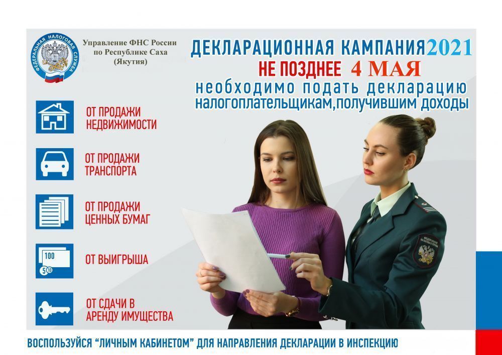 Управление ФНС России по Республике Саха (Якутия) напоминает, что до 4 мая 2022 года необходимо представить декларацию о доходах, полученных в 2021 году.