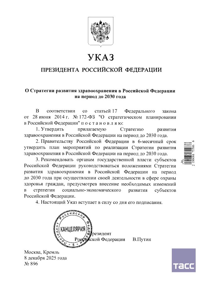 Президент РФ утвердил Стратегию развития здравоохранения в Российской Федерации на период до 2030 года. Соответствующий указ был подписан 8 декабря.