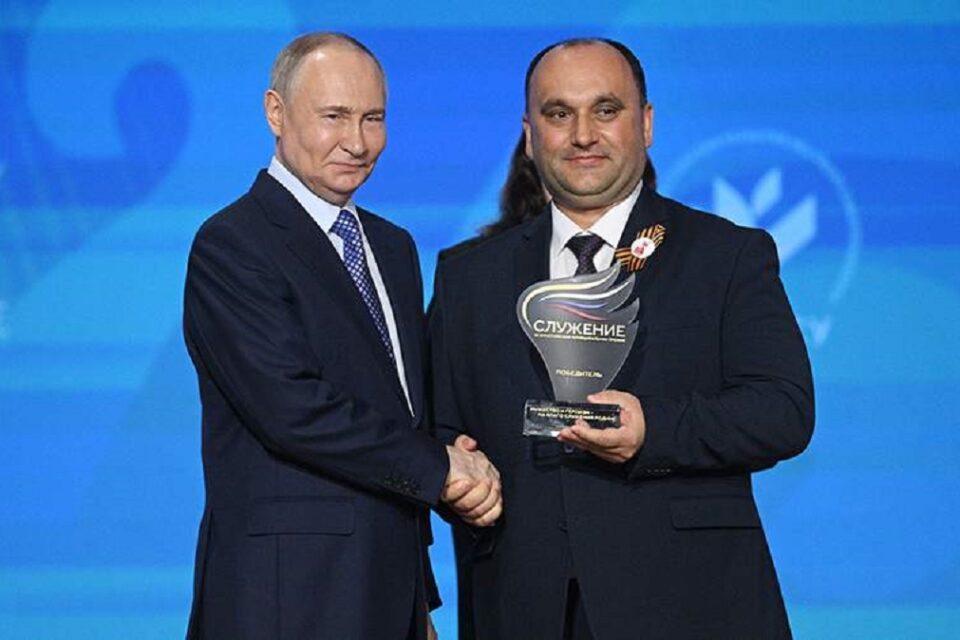 21 апреля в национальном центре «Россия» в рамках второго всероссийского муниципального форума «Малая родина — сила России» состоялась церемония награждения лауреатов и победителей второй всероссийской муниципальной премии «Служение». Награду победителю в номинации «Мужество и героизм — на благо служения Родине» вручил президент Российской Федерации Владимир Путин.