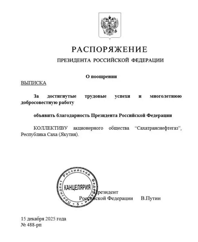 Президент России Владимир Путин за достигнутые трудовые успехи отметил благодарностью коллектив АО «Сахатранснефтегаз». Компания в 2025 году построила рекордные 400 км газопроводов, а по программе социальной газификации охватила более 10 тысяч домовладений.