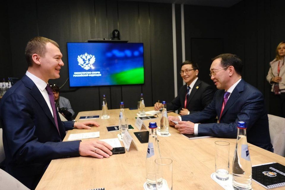 Глава Якутии Айсен Николаев и министр спорта РФ Михаил Дегтярев обсудили реализацию мастер-планов Якутска и Нерюнгри в части строительства спортивных объектов, подготовку инфраструктуры к VIII международным спортивным играм «Дети Азии», а также предложения в национальный проект «Продолжительная и активная жизнь».