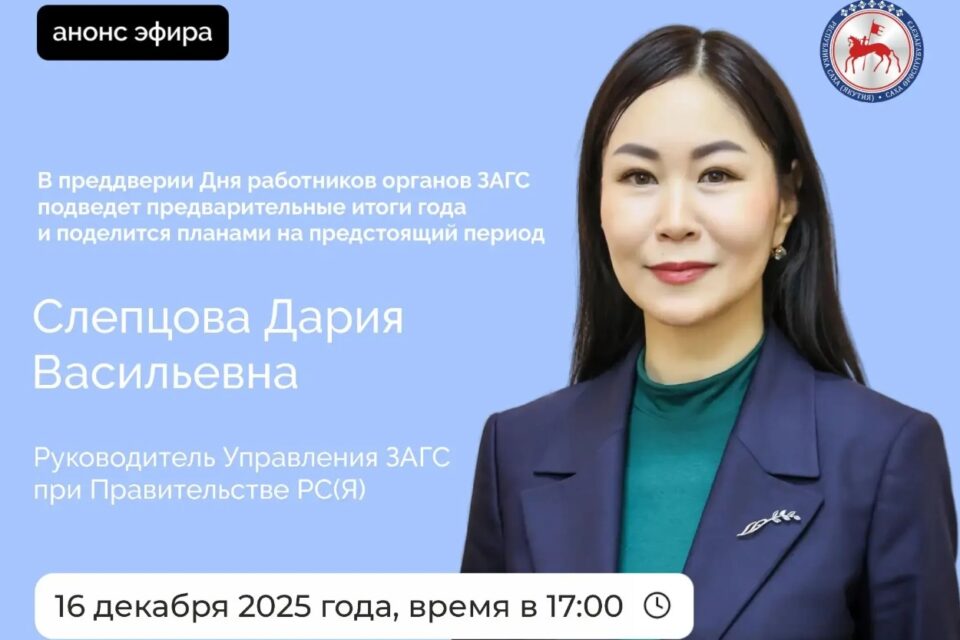 Руководитель Управления ЗАГС при правительстве Якутии Дария Слепцова 16 декабря проведет прямой эфир в социальных сетях «ВКонтакте» и «Одноклассники». Трансляция состоится во вторник в аккаунтах Sakhagov.