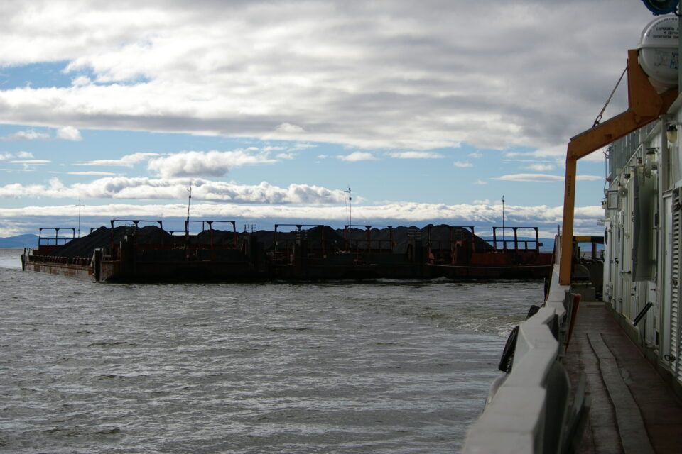Ледокол «Капитан Бабичев» с составом их двух барж с каменным углем следует на Быков Мыс, вчера состав прошел Жиганск.