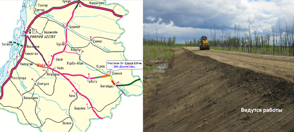 В Горном и Мегино-Кангаласском районах республики дорожники построят 31,71 км автомобильных дорог. На завершающей стадии находятся работы по устройству земляного полотна на участках Бясь-Кюель – км 95, км 95 – км 108 автомобильной дороги «Кобяй», протяженностью 22,42 км.