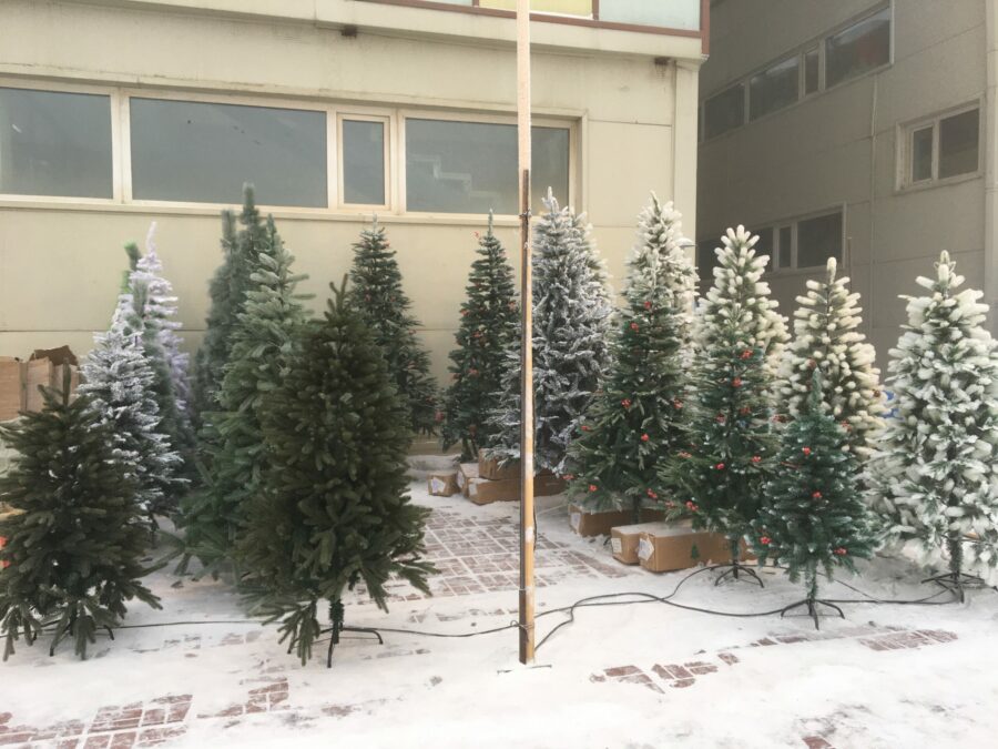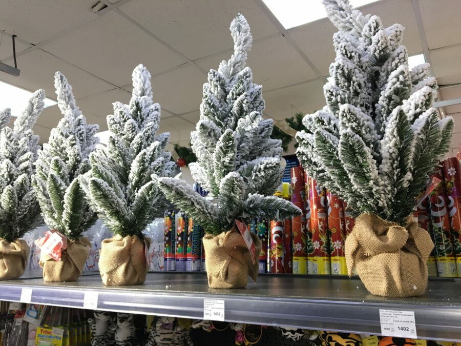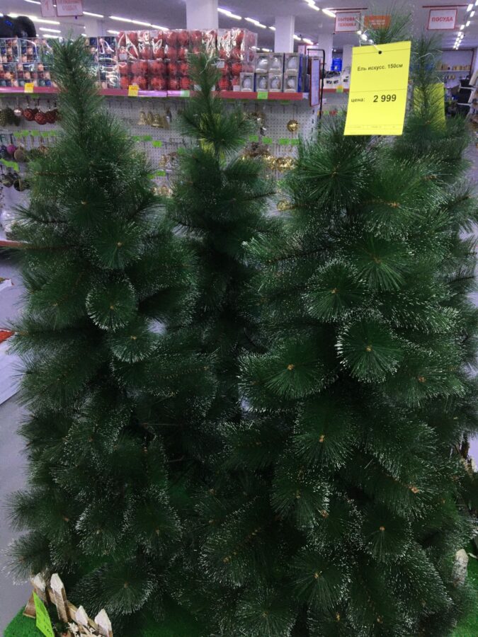 Приезжаем в торговый центр на Вилюйском тракте. Здесь на втором этаже вырос новогодний лес. Много раскидистых елей разного формата и окраса. В основном, все деревья высокие. Есть искусственная елочка в мешочке, стоит 2475 рублей, высота 60 см. На первом этаже у входа кучкуются акционные елки — 2999 рублей за 1,5 метра. Хорошенькие, пушистые.