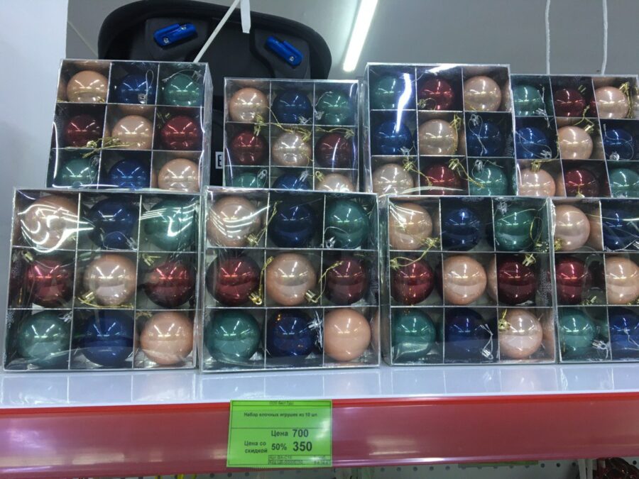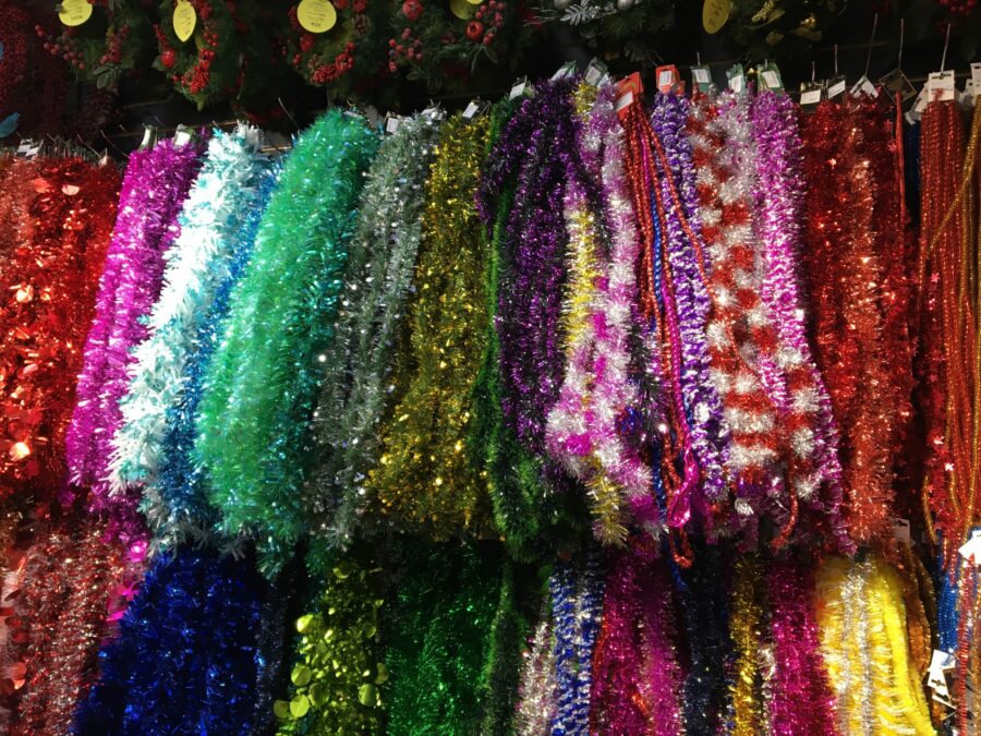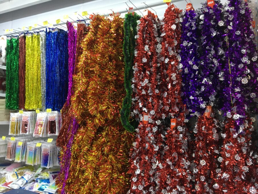 Стоимость 3-метровой гирлянды от 200 рублей. Цены на игрушки такие же, как и в других торговых точках. Густая мишура стоит 70-80 рублей.