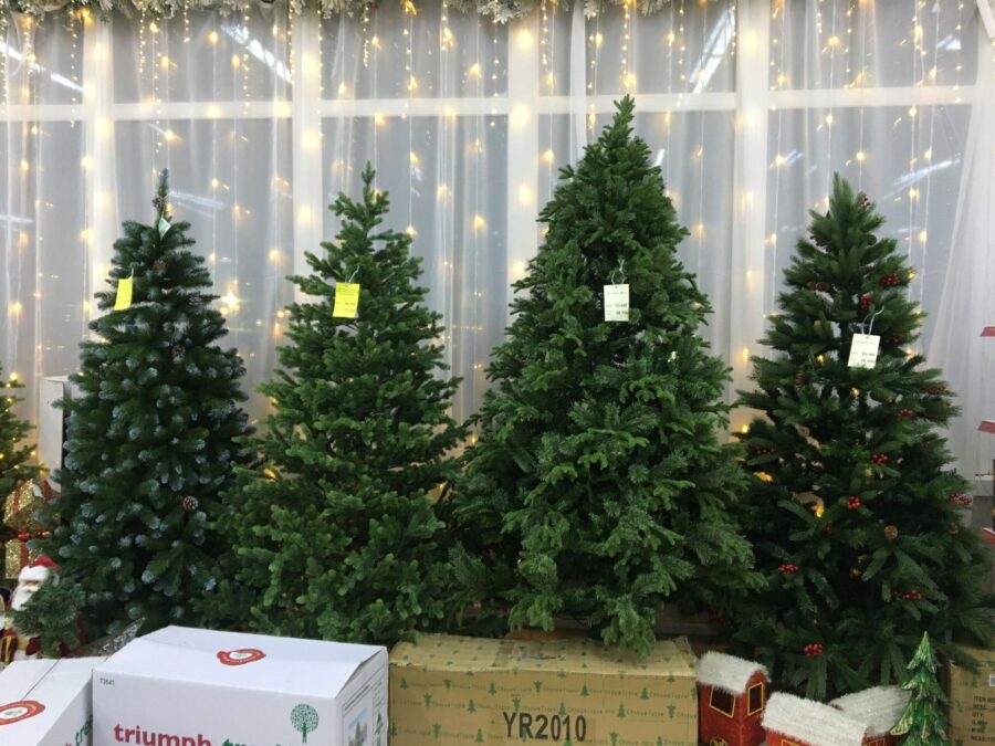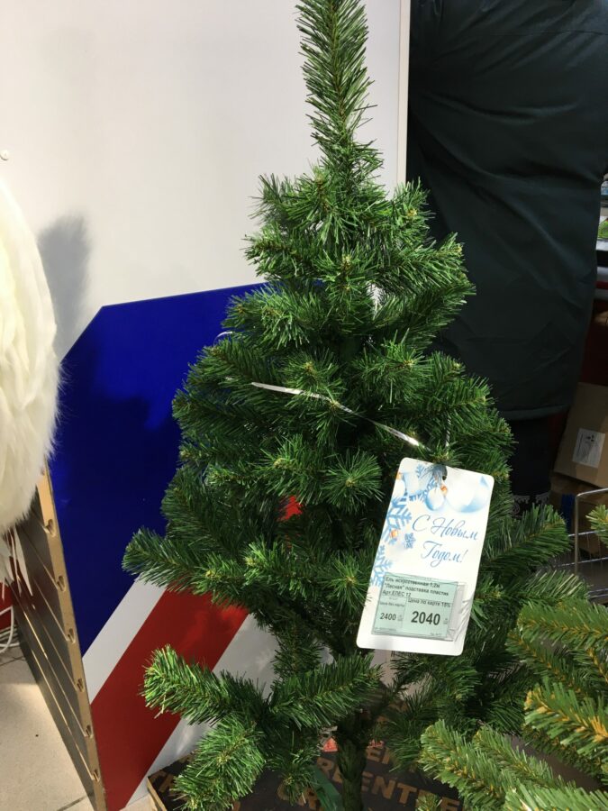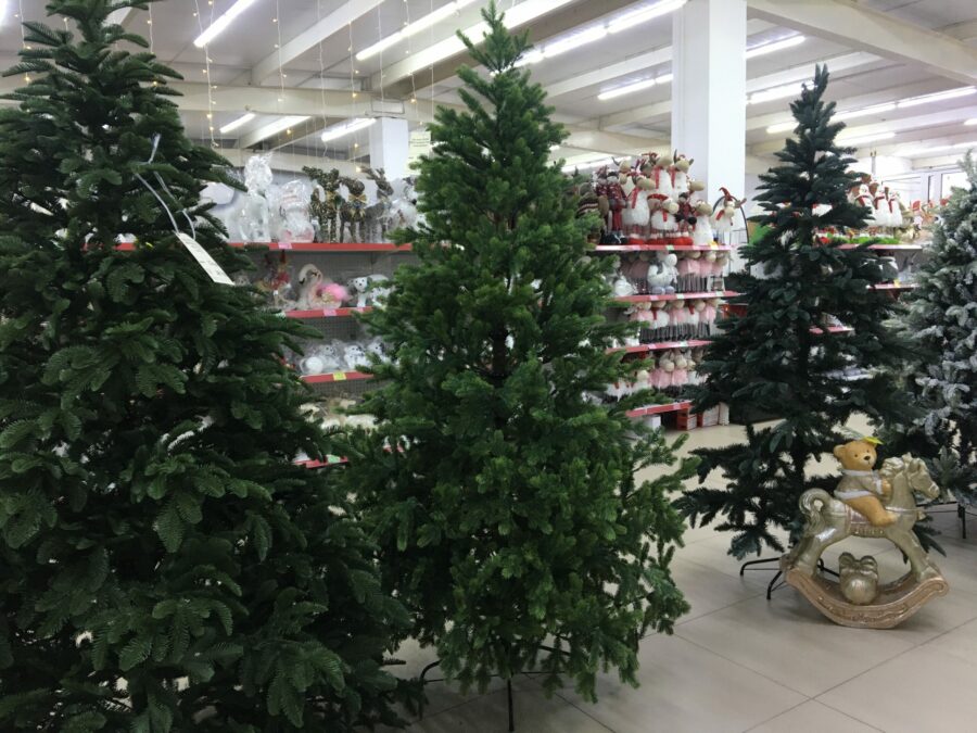 В самом здании большой выбор настольных елок. Напольных елей несколько. Самая маленькая в 1,2 метра стоит 2400 рублей (без учета дисконта, в дальнейшем все цены будут указаны так же). Белоснежная ель в 2,2 метра — 12600 рублей.