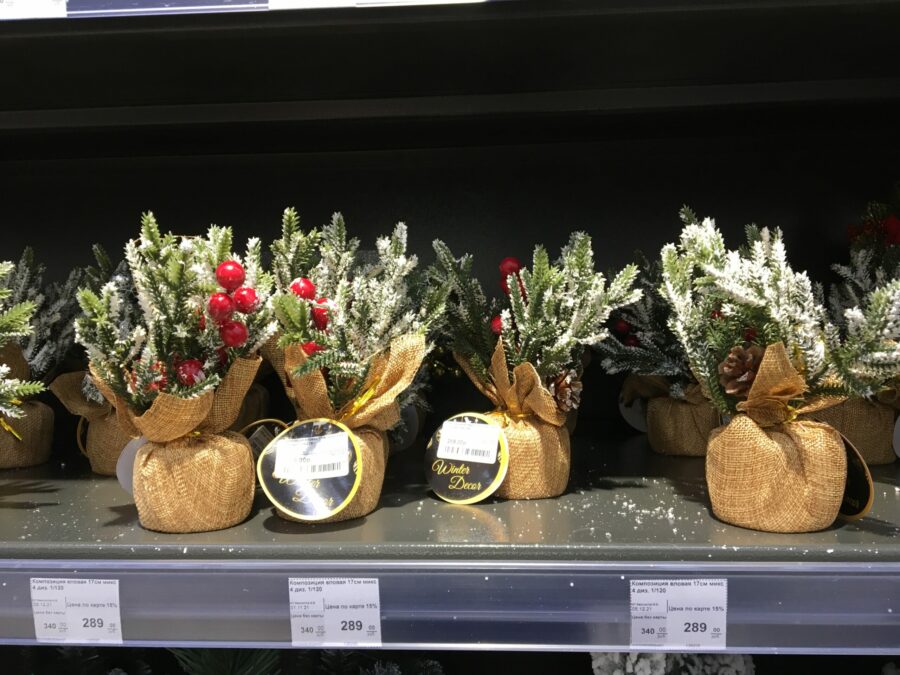 А вот ассортимент миниатюрных елок до полуметра — огромный. Есть в горшочке, в мешочке, на подставке, припорошенные снегом, с шариками, с ягодами. Цены от 340 рублей до 1650 рублей. Нужно отметить, что белая имитация снега на некоторых елках осыпается.